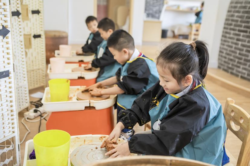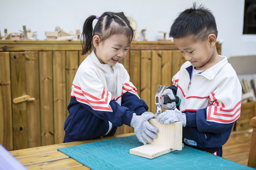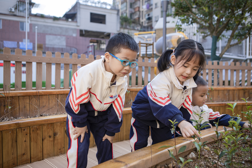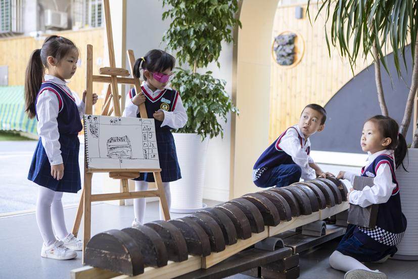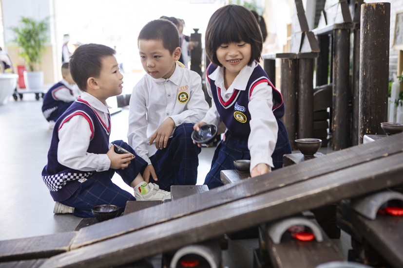幼兒園在戶內(nèi)外空間的建設(shè)、生活環(huán)境的創(chuàng)設(shè)、游戲材料的豐富等都以幼兒需要和興趣為導(dǎo)向,以幼兒發(fā)展為根本。在這個(gè)“樂園”里,師幼一起探索著身心快樂的要義,幼兒學(xué)會(huì)快樂生活、樂享游戲、樂于學(xué)習(xí),獲得寶貴的成長經(jīng)歷。而教師們?cè)敢庾?ldquo;樂園”里的耕耘者,用心陪伴和用愛守護(hù)的支持者。順應(yīng)兒童興趣需求,創(chuàng)設(shè)了探究的游戲環(huán)境,幼兒可以從室內(nèi)玩到戶外,從地面玩到平頂;戶外有各類果樹、茶樹、花卉、蔬菜;有山坡隧道、戰(zhàn)壕堡壘、沙水管道、小橋坡道,這樣巧奪天工的天然設(shè)計(jì),讓幼兒感覺到自然天成和身臨其境的情境教育;順應(yīng)發(fā)展需求,創(chuàng)設(shè)可學(xué)習(xí)的游戲環(huán)境,有娃娃家、種植區(qū)、探究區(qū)、藝術(shù)區(qū)等,孩子們?cè)诓莸乩锎顜づ瘢^當(dāng)鍋樹葉抵菜、拿著顯微鏡觀察茶葉的葉脈,在水池里用不同工具打撈泥鰍,在涂鴉墻上盡情潑墨,孩子們?cè)谠丁⒉皇碌耧椀挠螒蛑校M顯野趣;順應(yīng)個(gè)性化需求,創(chuàng)設(shè)可嘗試的游戲環(huán)境,建盞館里有孩子、家長和老師三方協(xié)力制作的非遺“建盞”,木工坊里,有孩子們稚嫩的小手制作了各具特色的木工作品,在操作中啟發(fā)心智、收獲有益經(jīng)驗(yàn)。