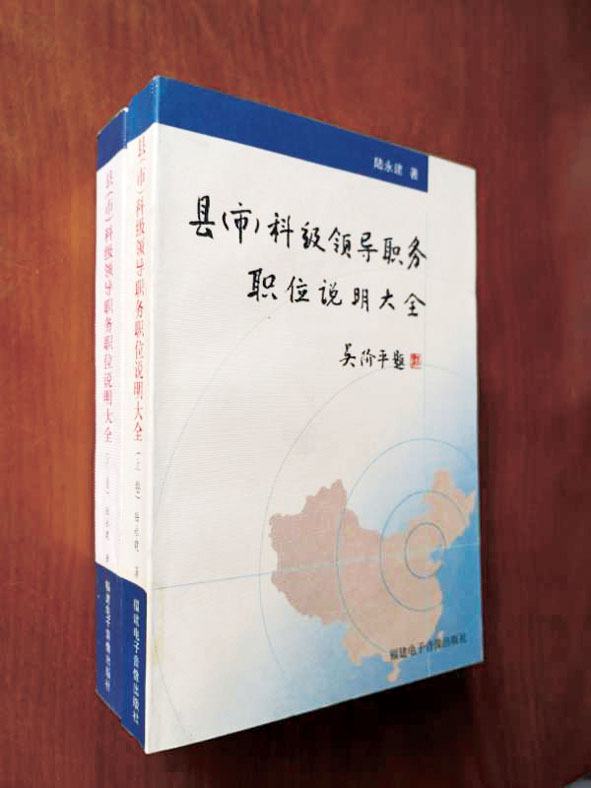 2001年,陸永建先生的專著《縣(市)科級領導職務職位說明大全》(上下卷)由福建電子音像出版社出版了,時任全國人大常委會副委員長吳階平親自題寫了書名。近20年過去,重新閱讀該書,那撲面而來的創(chuàng)新氣息還是那么濃厚。更讓人驚奇的是,作為一本研究縣(市)科級領導職務職位說明的專著,自從陸永建開山之后,竟成一枝獨秀,無出其右,其學術價值和社會價值更是經(jīng)得起時間的檢驗,尤顯珍貴。”